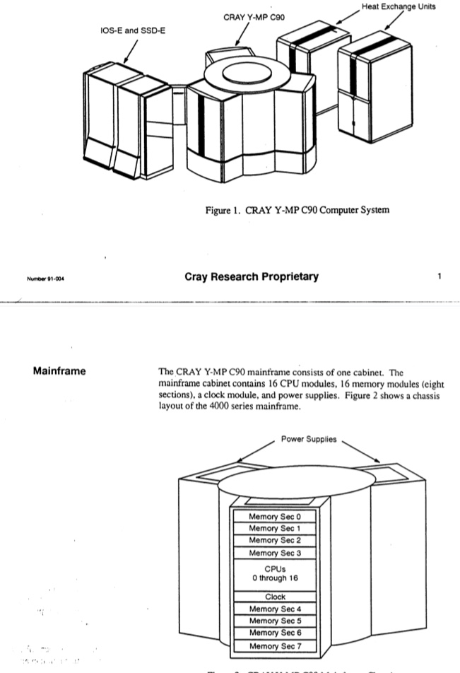 The C90 range of systems came in a three different cab shapes. The three prongs round a cylinder box for the top end 16 CPU version, cylinder with two boxes for the 2 and 4 cpu versions. The IOS/SSD cabs look like a YMP-model E shape. The C94 and C92 could be configured with secondary air (different shape box cylinder at front) cooling and would have a rectangular box on back.